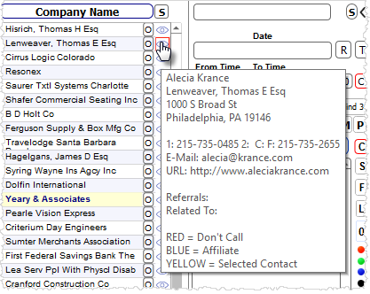 Each contact on the list has an eye icon at the right side of their line. Hover the icon to show the information of the contact at left. You can also click on the icon to show a pop-up of the contact information. Note that it will not show the full information of the contact, just the snippet of the important details.