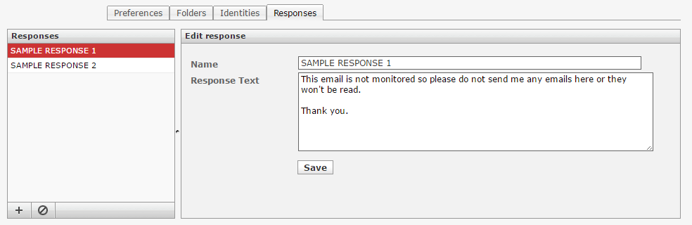 Select a response by clicking it to see the name and text in the form on the right. You can right away edit both and save changes by clicking the Save button.