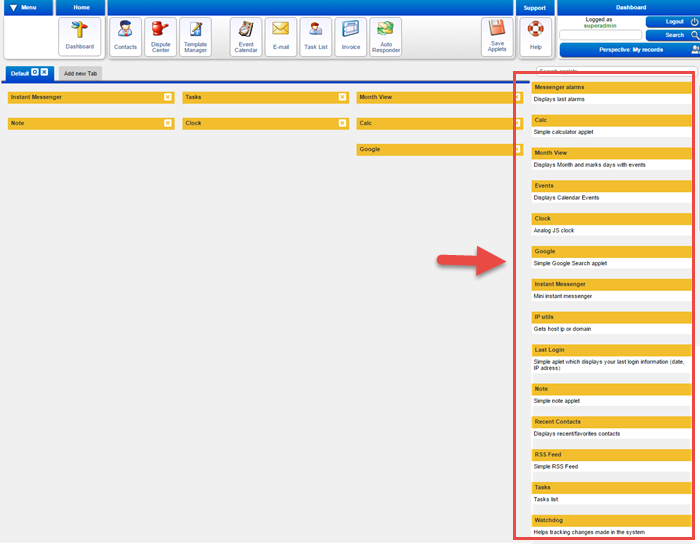 at the right side for all available applets.