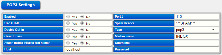 This allows you to setup email-based subscriptions. When someone sends an email to this account it will start a subscription process for them. Despite the name it also supports imap if you want to use that. This area uses the imap() routines in php so you'll need those compiled. There are various related options. The spam header is particularly nice if the address has spamassassin running. The system will ignore these messages and not subscribe them.