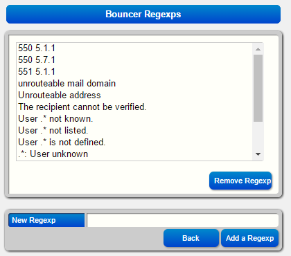 All regular expression are set case-insensitive and multi-line, so you only need to add the pattern. This is the bouncer rules area. Here you add perl-compat regular expression rules to detect and remove bounced addresses. If you know perl regexp you can add your own.