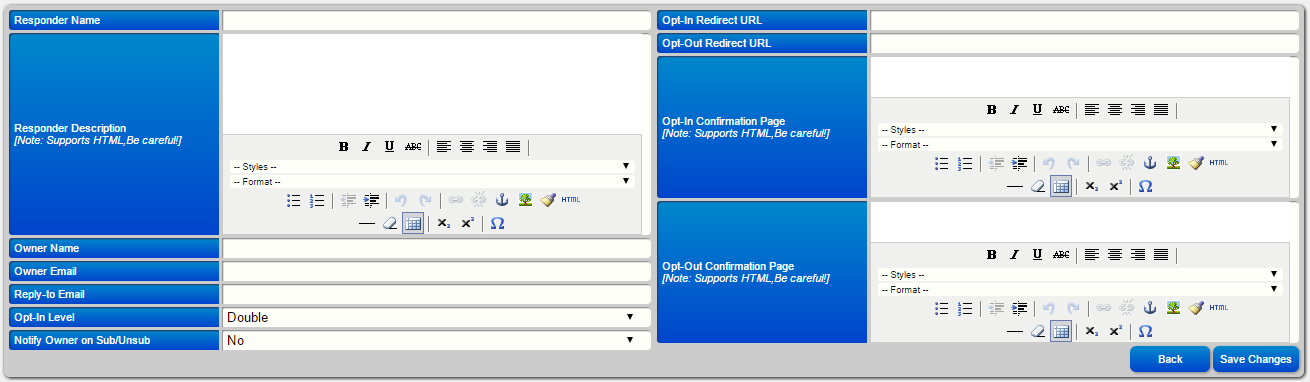 Confirmation Pages: These are html-capable areas that are presented to the user after they're sent a confirmation code. This allows responder-level changes, if you leave these fields blank the system will default the global confirmation templates. You don't need to use these, but you can if you want a more fine-grained control over these messages.