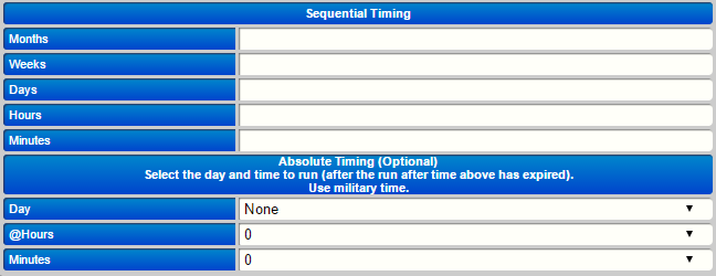 Absolute timing adds to sequential timing by re-positioning the timer at a specific moment of that day. For instance if you want a message to be set for the wednesday of the week after they join, you can do that here. You'd set the weeks in sequential to 1, and then set the day to "wednesday" and it'll be set for then. Here you can specify a day, if you do it'll re-position the minutes and hours to midnite so, for example, you can schedule a message to go out on Friday at 8pm, 1 month after their join.