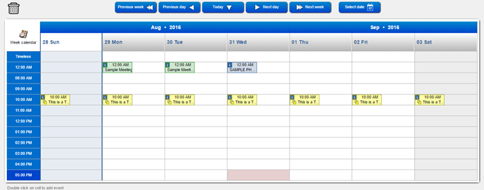 Week view is similar to Day view. There are, however, two differences - events from seven, not only one, consecutive days are displayed and the navigating panel is slightly different, as it allows also navigating with the week leaps.