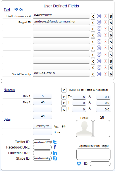 This is where you enter the fields for the contact that contain dates. The Age field however, is used to filter the contacts database based on a date range. Also, in the first date field, once filled in, the Age field is automatically filled in with the calculated age as well as the zodiac sign based on the entered date of birth.