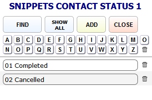 To add snippets of status where you can just select for the contact, click the S button beside the particular status field. This will then open the snippet window where you can manage.